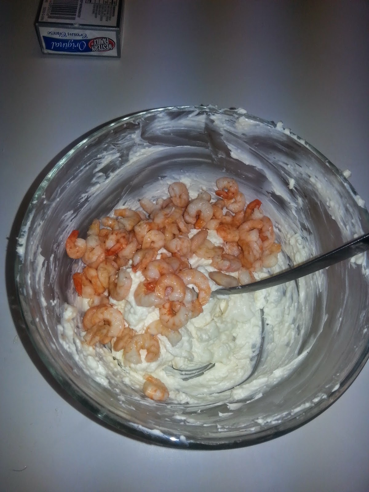 until mixed, but still a little bit chunky.  Add shrimp, and onion salt.